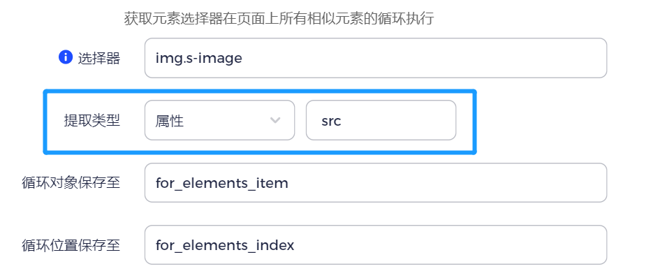 第2步:下载图片需要知道图片的URL链接,比如是http://xxxx.jpg. https://xxxx.png 。而该图片元素中,src属性的值恰好是图片的URL链接。所以,我们需要提取src属性的值,将src的值存为变量:for_elements_item。如下图蓝框所示: