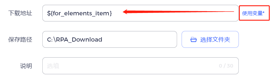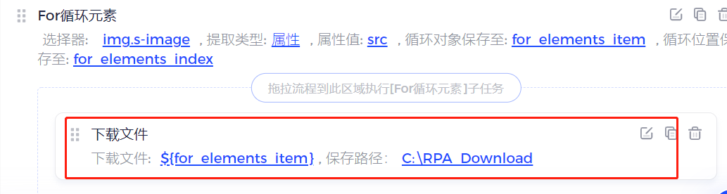 第3步:因为下载图片,需要用到【下载文件】这个功能。同时,因为需要下载图片,所以,下载地址可以用到上一步使用的变量:for_elements_item。如下图红框所示: