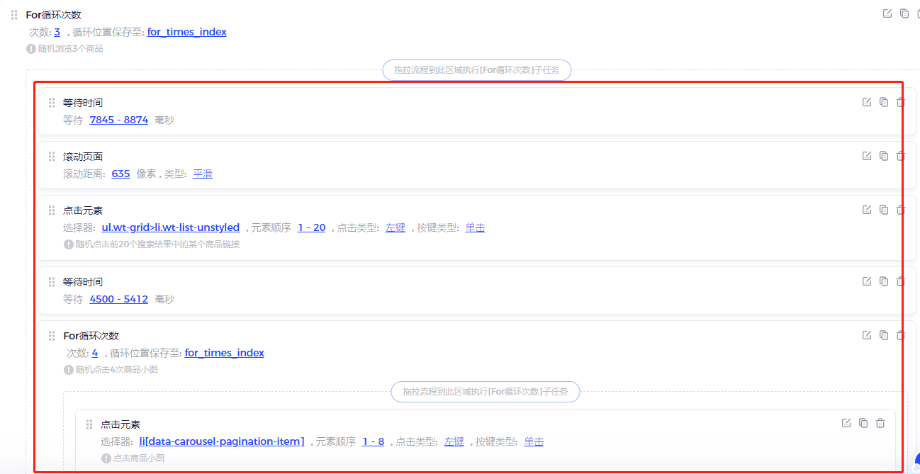 例如,需要随机浏览3个商品,首先要点击其中一个搜索结果,然后滚动页面,点击相关按钮,然后再返回,继续点击另外一个搜索结果。这些步骤都是机械,重复的。所以,我们可以通过【For循环次数】去完成。