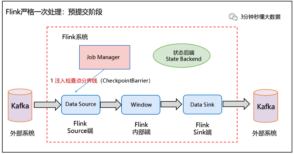 3、Slink 端:从 Source 端开始,每个内部的 transformation 任务遇到 checkpoint barrier(检查点分界线)时,都会把状态存到 Checkpoint 里。数据处理完毕到 Sink 端时,Sink 任务首先把数据写入外部 Kafka,这些数据都属于预提交的事务(还不能被消费),此时的 Pre-commit 预提交阶段下Data Sink 在保存状态到状态后端的同时还必须预提交它的外部事务,如下图所示: