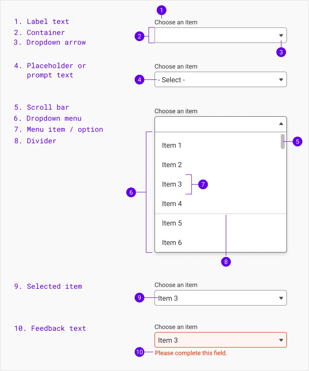 下拉菜单的设计图解和文本输入框很接近,只是内容多一些。(1.栏目内容 2.容器 3.下拉箭头 4.占位符或提示文本 5.滚动条 6.下拉菜单 7.菜单项 8.分割线 9.选中项 10.提示)