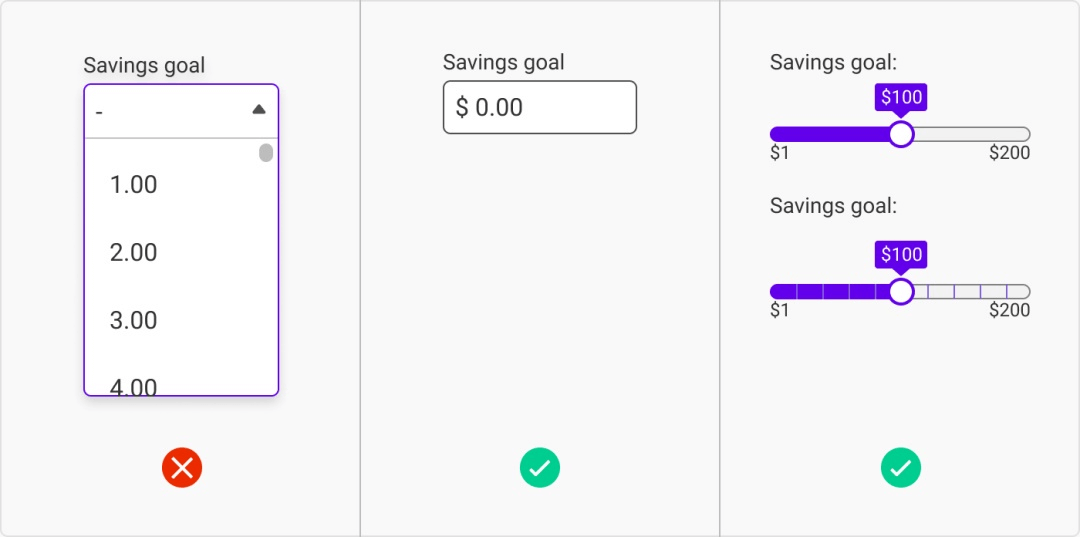 首先,再一次,让他们打字输入。步骤条(steppers)也同样有效,可是我只建议在预期步骤不会多于5步的情况下使用。不然,用户会可怜巴巴地坐在那儿点到100。