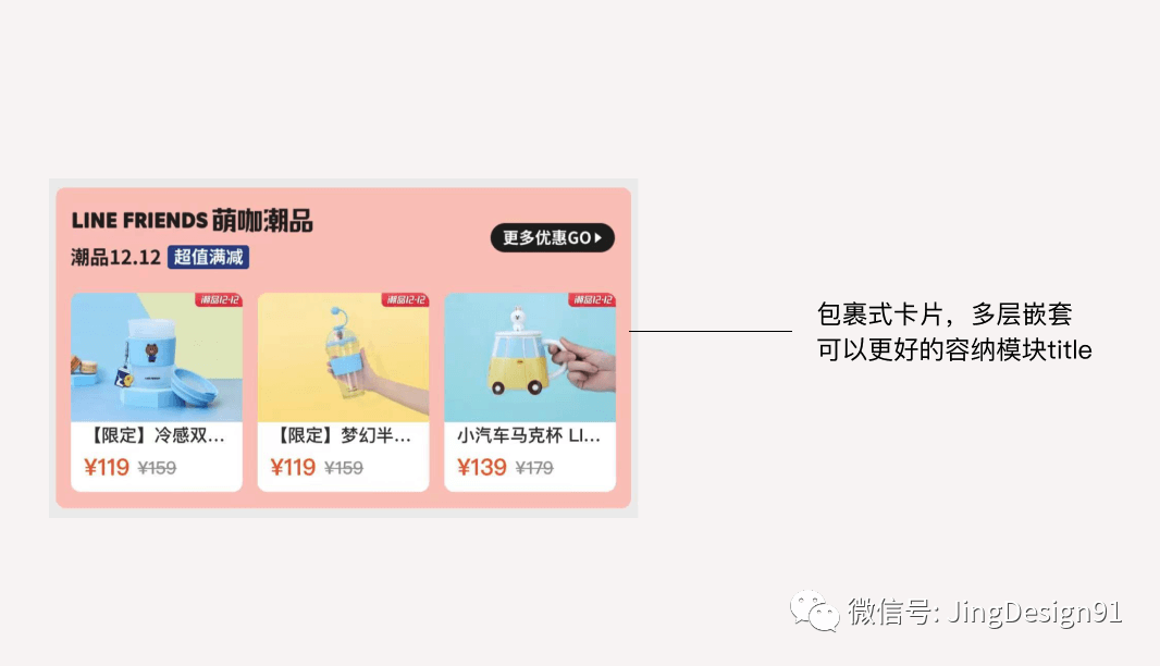 很多同学对用卡片后title无处安放表示不解,这里的模块设计提供了一种很好的示例。模块嵌套模块,多层模块可以很好的容纳Title部分的文字,让模块更加统一。然后,配图同样是纯色打底,这是页面不混乱的核心。