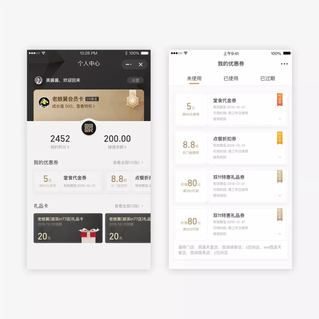 会员的个人中心页提供了各个资产管理的入口,区别于市面上竞品对资产入口的处理,我们将信息层级进行了扁平化处理,前置透出各类权益,让用户对权益资产有明确的感知,促进用户到线下进行核销。