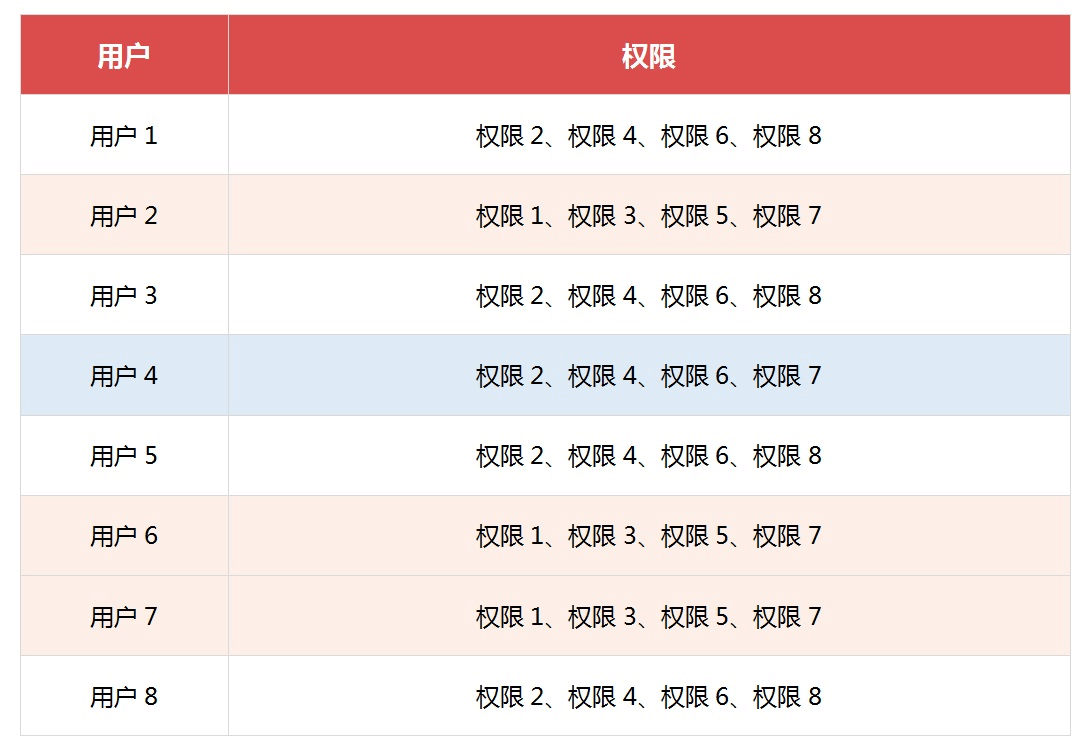 例如:用户 1~用户 8 分别拥有以下权限,不同用户具有相同权限的我用不同的颜色做了区分,如下图: