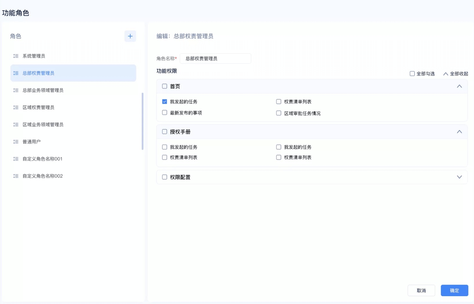 B 端项目中一般会建立几个默认的角色是不支持用户修改、删除的,例如最常见的系统管理员,而也会需要有其它角色的需求,所以此模块需要支持用户新建角色,功能角色是对大模块的页面和操作的权限设置,操作权限的颗粒度可以细分到每个页面的每一个按钮的操作,如下图:
