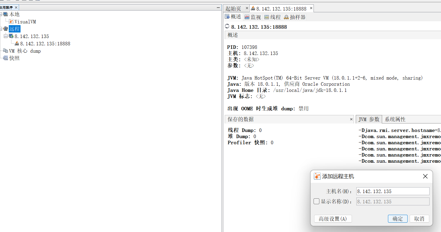 -Djava.rmi.server.hostname=8.142.132.135 #远程服务器IP-Dcom.sun.management.jmxremote.port=18888 #远程服务器JMX端口-Dcom.sun.management.jmxremote.rmi.port=19999 #远程服务器RMI端口,这个很重要!!!-Dcom.sun.management.jmxremote #开启远程服务器链接-Dcom.sun.management.jmxremote.ssl=false #ssl链接关闭-Dcom.sun.management.jmxremote.authenticate=false #关闭权限校验