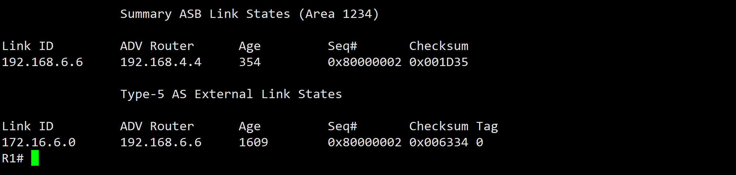 - R1 上看到的 Type4 和 Type5 , Type5 是告诉所有人(包含192.168.6.6 所在的区域)去172.16.6.0 要找 192.168.6.6, Type4 是告诉其他(不包含192.168.6.6 所在的区域)怎么去找192.168.6.6