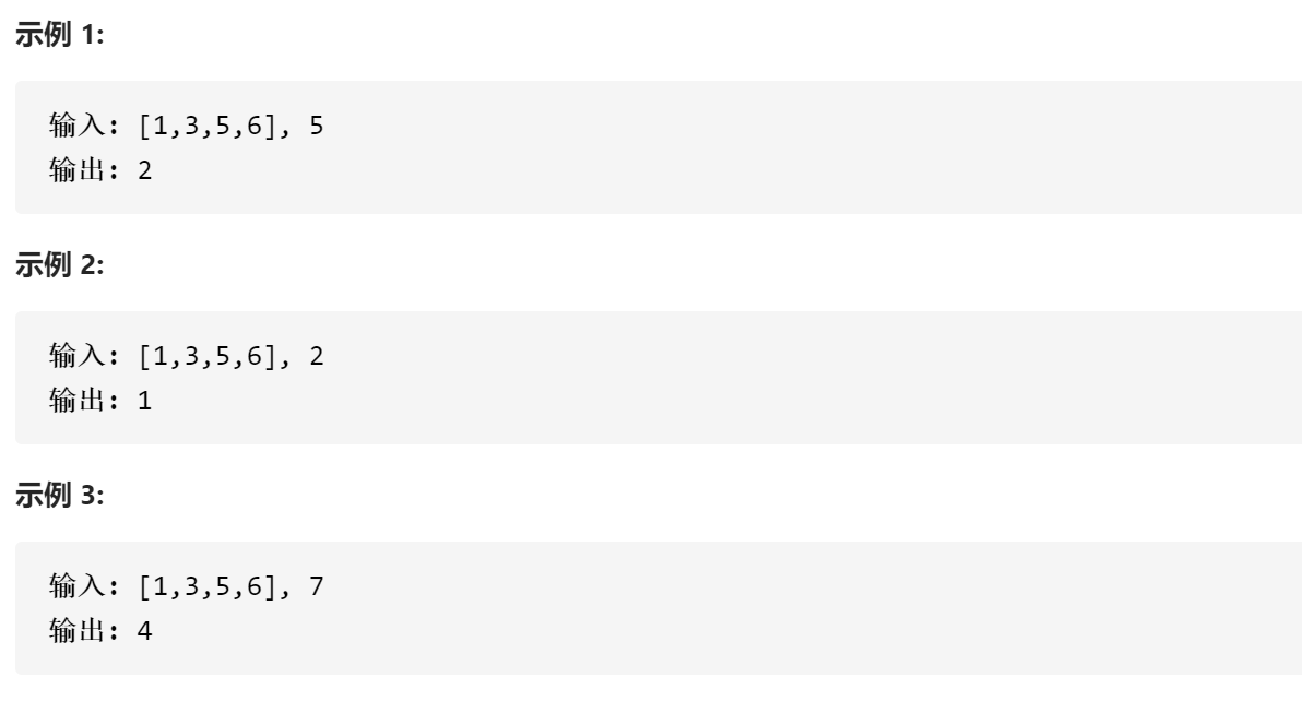 class Solution:def searchInsert(self, nums: List[int], target: int) -> int:if len(nums) == 0 or nums[0] > target:return 0left, right = 0, len(nums) - 1while left + 1 < right:mid = left + (right - left) // 2if nums[mid] == target:return midelif nums[mid] > target:right = mid - 1else:left = mid + 1if nums[left] >= target:return leftelif nums[right] >= target:return rightelse:return right + 1