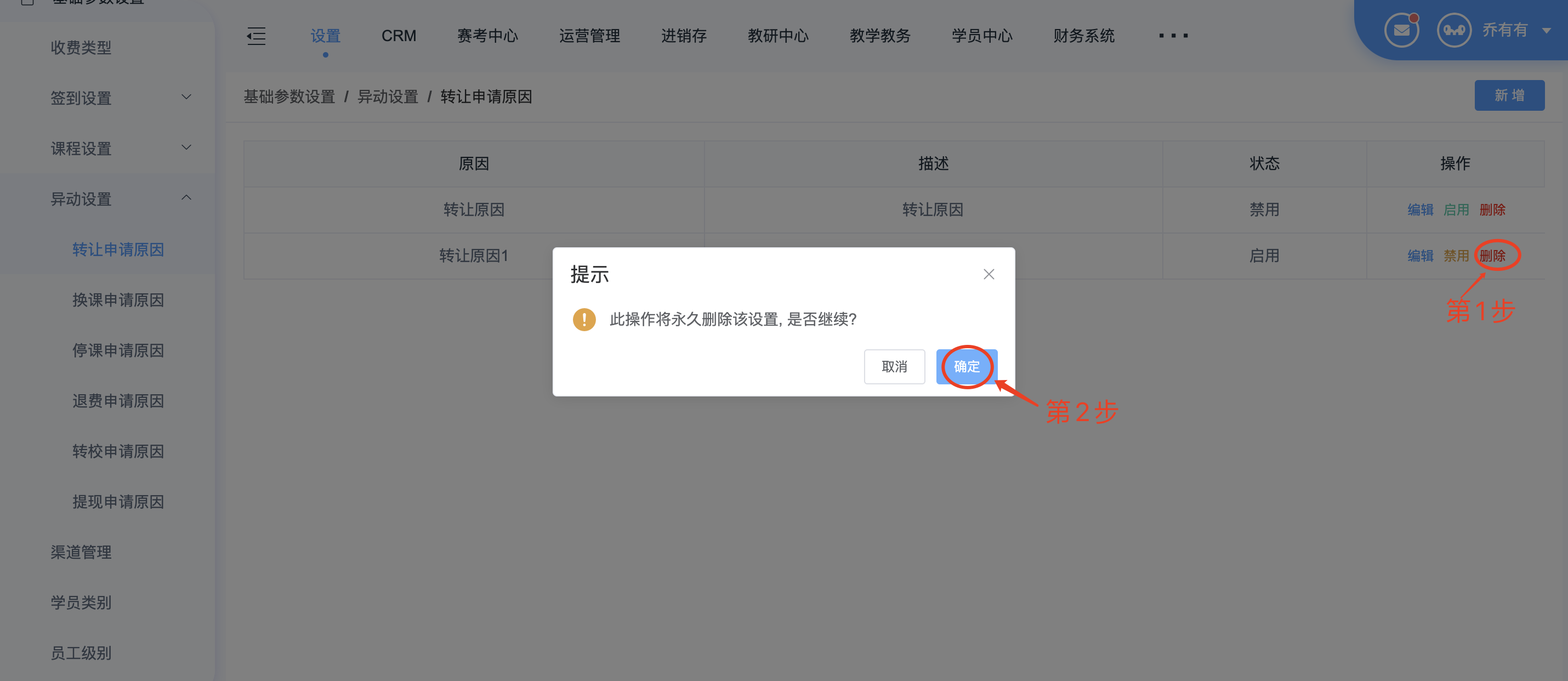 点击「系统设置」→「基础参数设置」→「异动设置」→「停课申请原因」,进入转让申请原因设置界面,可对转让申请原因进行自定义配置,支持新增、编辑、启用/禁用和删除操作,功能及操作同转让申请原因相同