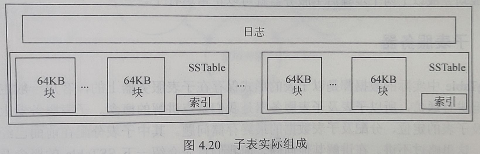 每个子表都是由多个SSTable及日志(Log)文件构成的。有一点需要注意,那就是不同子表的SSTable可以共享,也就是说某些SSTable会参与多个子表的构成,而由子表构成的表则不存在子表重叠的现象。BigTable中的日志文件是一种共享日志,也就是说系统并不是对子表服务器上的每个子表都单独地建立一个日志文件,每个子表服务器上仅保存一个日志文件,某个子表日志只是这个共享日志的一个片段。这样会节省大量的空间,但在恢复时却有一定的难度,因为不同的子表可能会被分配到不同的子表服务器上,一般情况下每个子表服务器都需要读取整个共享日志来获取其对应的子表日志。Google为了避免这种情况出现,对日志做了一些改进。BigTable规定将日志的内容按照键值进行排序,这样不同的子表服务器都可以连续读取日志文件了。一般来说每个子表的大小在100MB~200MB之间。每个子表服务器上保存的子表数量可以从几十到上千不等,通常情况下是100个左右