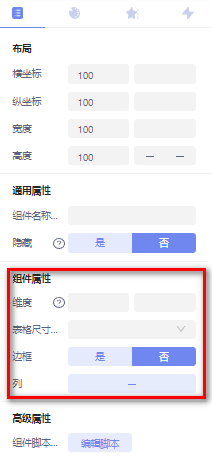 数据表格:数据表格用于展示聚合数据,可以用在历史数据和工作表视图中,基本属性配置如图:维度:当数据源为多维度数据时,可指定维度,默认维度(0)表格尺寸:表格尺寸共三种选择,默认、中和小,任选其一边框:点击是,表格配置边框列:表格列数设置