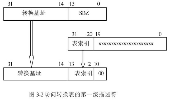 转换表基址寄存器的 bits[31:14]与虚拟地址的 bits[31:20]和两个0位连接形成32为物理地址,如图3-2。这个地址选择了一个四字节的转换表入口,它是第一级描述符或是指向第二级页表的指针。<br />