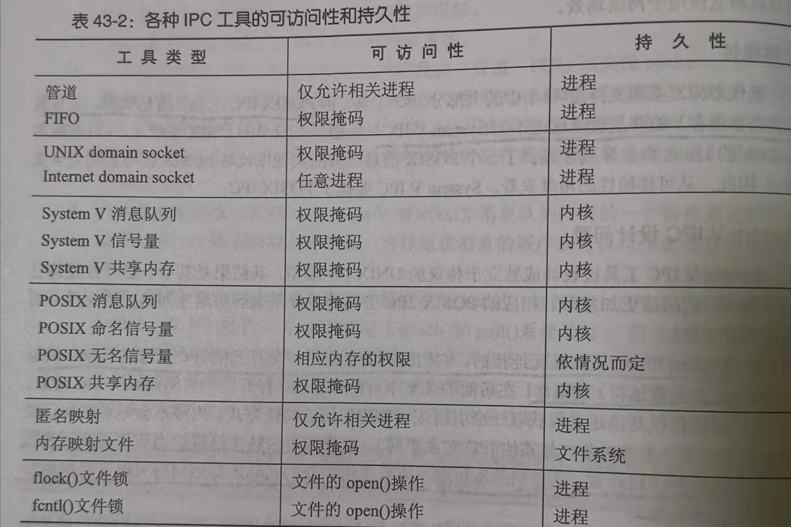 - 文件系统持久性:会在系统重启的时候保持其中的信息,直到被显式的删除,唯一具备文件系统持久性的IPC对象是基于内存映射文件的共享内存