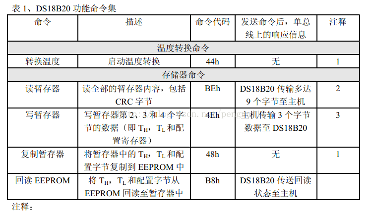 在主机发出 ROM命令,以访问某个指定的 DS18B20 接着就可以发出 DS18B20, 支持的某个功能命令。这些命令允许主机写入或读出 DS18B20 暂存器,启动温度转换以及判断从机的供电方式。 DS18B20 的功能命令总结于表1中,并在图3 流程图中作了说明 <br />表1 DS18B20 功能命令集<br /><br /> 1、在温度转换和复制暂存器数据至 EEPROM期间,主机必须在单总线上允许强上拉。并且在此期间,总线上不能进行其它数据传输 ;<br /> 2、通过发出复位脉冲,主机能够在任何时候中断数据传输;<br /> 3、在复位脉冲发出前,必须写入全部的三个字节 。<br /><br />