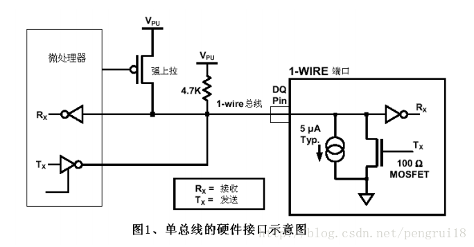 顾名思义,单总线只有一根数据线。设备(主机或从机)通过一个漏极开路或三态端口,连接至该数据线,这样允许设备在不发送数据时释放数据总线,以便总线被其它设备所使用。单总线端口为漏极开路其内部等效电路如图1 所示 。<br /> <br /> 单总线要求外接一个约5k 的上拉电阻;这样,单总线的闲置状态为高电平。不管什么原因,如果传输过程需要暂时挂起,且要求传输过程还能够继续的话,则总线必须处于空闲状态。位传输之间的恢复时间没有限制,只要总线在恢复期间处于空闲状态(高电平)。如果总线保持低电平超过 480us,总线上的所有器件将复位。另外在寄生方式供电时,为了保证单总线器件在某些工作状态下(如温度转换期间 EEPROM写入等)具有足够的电源电流,必须在总线上提供强上拉(如图 1所示的MOSFET )。