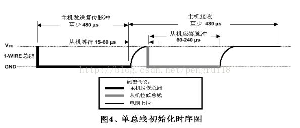 基于单总线上的所有传输过程都是以初始化开始的,初始化过程由主机发出的复位脉冲和从机响应的应答脉冲组成。应答脉冲使主机知道,总线上有从机设备,且准备就绪 。复位和应答脉冲的时间详见单总线信号部分 。