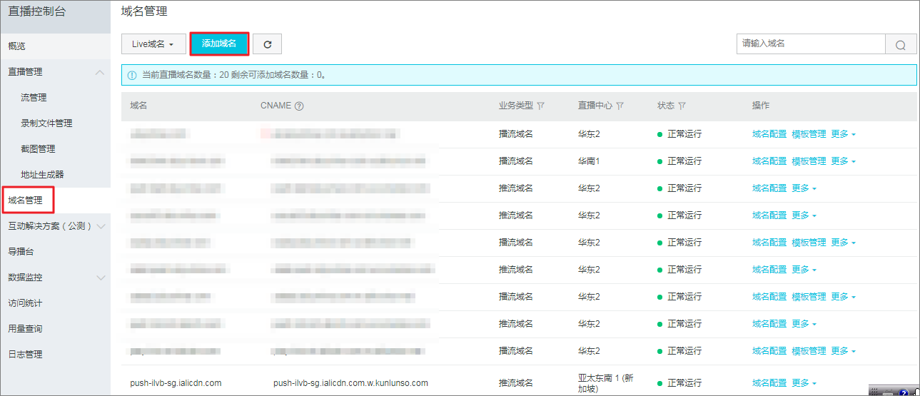 - 播流域名添加成功。请您重复以上步骤添加推流域名。