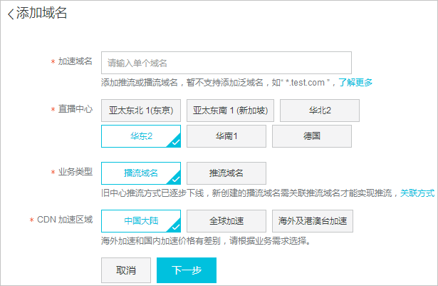 说明- 直播中心:指直播中心所在地域,直播推流域名与播流域名必须在一个地域。