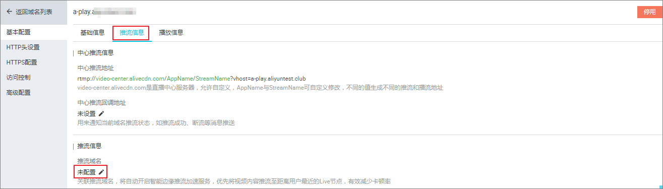 - 在 基本配置 > 推流信息 中,选择 推流信息 并单击 未配置。
