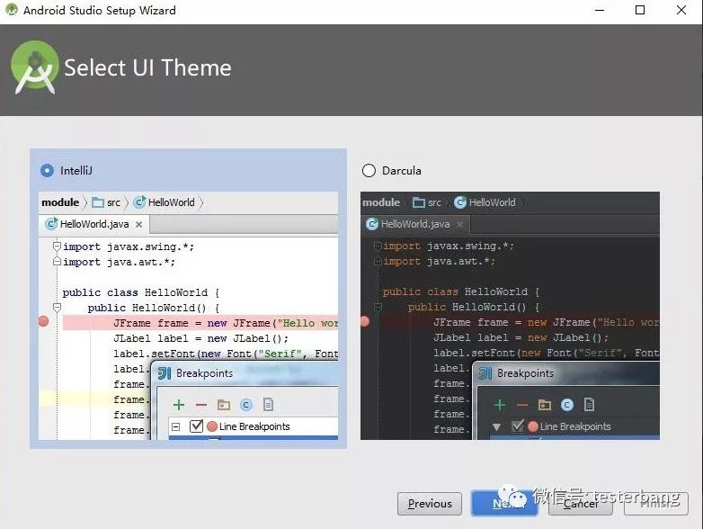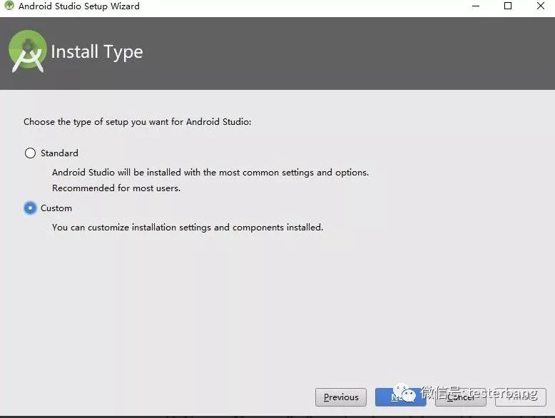 Android Studio是专门用来开发Android应用的IDE(集成开发环境),类似于其他IDE如Eclipse。有时候需要查看开发源码、编写个Android应用等都需要用到这个IDE,因此可以进行安装下。可以通过Android Developer站点进行下载,要翻墙才能访问,Google提供了一个国内可以访问的地址,可通过如下的地址进行下载:<br />https://developer.android.google.cn/studio/index.html<br />大家也可以通过我第一个小节里介绍的百度网盘里下载到Android Studio的安装包,最好跟我安装的版本保持一致。<br />安装过程如下:<br /><br /><br />接着按照提示完成Android Studio后启动AS(Android Studio)。<br />没有安装过就选择下面的无需导入任何设置:<br /><br />过程中如果弹出如下的错误,直接点击Cancel就行(由于某些URL被墙),如下:<br /><br />接着在向导页面点击下一步,接着在选择设置类型选择自定义,这样可以自定义Android SDK的安装路径,如下所示:<br /><br />接着出现的窗口选择你喜欢的主题,点击下一步<br /><br />接着按下图所示勾选下Android SDK Platform和模拟器加速的以及Android模拟器的选型,同时可以设置下Android SDK的路径,这里我设置在“c:\sdk”,这个路径不要有中文、空格、特殊字符等,具体如下:<br /><br />最后点击Finish按钮进行勾选组件安装就行。