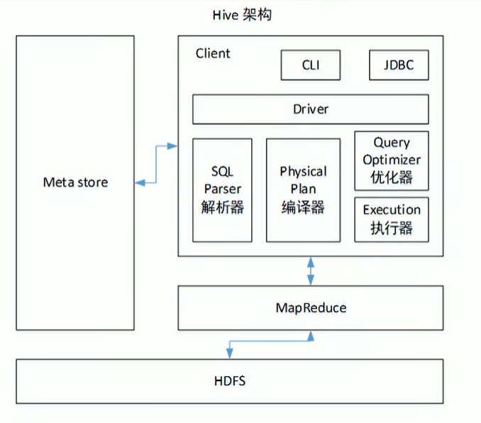 CLI(command-line interface)、JDBC/ODBC(jdbc访问Hive)、WEBUI(浏览器访问Hive)- 元数据:Meta store