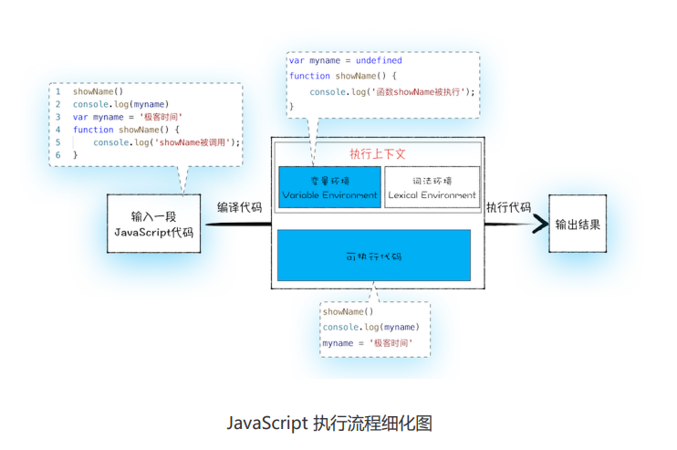 <a name="kxahF"></a>### javascript 代码的执行流程> 实际上变量和函数声明在代码里的位置是不会改变的,而且是在编译阶段被javascript引擎放入内存中,编译完成后在进入执行阶段。<a name="4DqOi"></a>#### 1.编译阶段第一部分:变量提升部分代码<br />第二部分:执行部分的代码<br /><br />**执行上下文 **是 js 执行一段代码时的运行环境,在执行上下文中存在一个变量环境的对象(Viriable Environment)该对象保存了变量提升的内容。<a name="KvvwM"></a>#### 2.执行阶段<a name="fuJKX"></a>#### 代码中出现相同的变量或者函数怎么办?```javascriptfunction showName(){console.log("chu")}showName() //初function showName(){console.log("初")}showName() //初
