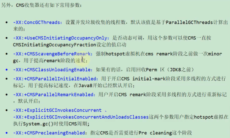 注意:1. Parallel回收器主打吞吐量,而CMS和G1主打低延迟,如果主打吞吐量,那么就不应该限制最大停顿时间,所以-XX:MaxGCPauseMills不应该设置1. -XX:MaxGCPauseMills中的调整堆大小通过默认开启的-XX:+UseAdaptiveSizePolicy来实现1. -XX:GCTimeRatio用来衡量吞吐量,并且和-XX:MaxGCPauseMills矛盾,因此不会同时使用<a name="ycjit"></a>#### 4.5 CMS回收器<br />-XX:ParallelCMSThreads和ParallelGCThreads有关系,ParallelGCThreads在上面Parnew回收器中有提到<br /><br />```java# CMS回收器-XX:+UseConcMarkSweepGC 年轻代使用CMS GC。开启该参数后会自动将-XX:+UseParNewGC打开。即:ParNew(Young区)+ CMS(Old区)+ Serial Old的组合-XX:CMSInitiatingOccupanyFraction 设置堆内存使用率的阈值,一旦达到该阈值,便开始进行回收。JDK5及以前版本的默认值为68,DK6及以上版本默认值为92%。如果内存增长缓慢,则可以设置一个稍大的值,大的阈值可以有效降低CMS的触发频率,减少老年代回收的次数可以较为明显地改善应用程序性能。反之,如果应用程序内存使用率增长很快,则应该降低这个阈值,以避免频繁触发老年代串行收集器。因此通过该选项便可以有效降低Fu1l GC的执行次数。-XX:+UseCMSInitiatingOccupancyOnly 是否动态可调,使CMS一直按CMSInitiatingOccupancyFraction设定的值启动-XX:+UseCMSCompactAtFullCollection 用于指定在执行完Full GC后对内存空间进行压缩整理以此避免内存碎片的产生。不过由于内存压缩整理过程无法并发执行,所带来的问题就是停顿时间变得更长了。-XX:CMSFullGCsBeforeCompaction 设置在执行多少次Full GC后对内存空间进行压缩整理。-XX:ParallelCMSThreads 设置CMS的线程数量。CMS 默认启动的线程数是(ParallelGCThreads+3)/4,ParallelGCThreads 是年轻代并行收集器的线程数。当CPU 资源比较紧张时,受到CMS收集器线程的影响,应用程序的性能在垃圾回收阶段可能会非常糟糕。-XX:ConcGCThreads 设置并发垃圾收集的线程数,默认该值是基于ParallelGCThreads计算出来的-XX:+CMSScavengeBeforeRemark 强制hotspot在cms remark阶段之前做一次minor gc,用于提高remark阶段的速度-XX:+CMSClassUnloadingEnable 如果有的话,启用回收Perm 区(JDK8之前)-XX:+CMSParallelInitialEnabled 用于开启CMS initial-mark阶段采用多线程的方式进行标记用于提高标记速度,在Java8开始已经默认开启-XX:+CMSParallelRemarkEnabled 用户开启CMS remark阶段采用多线程的方式进行重新标记,默认开启-XX:+ExplicitGCInvokesConcurrent-XX:+ExplicitGCInvokesConcurrentAndUnloadsClasses这两个参数用户指定hotspot虚拟在执行System.gc()时使用CMS周期-XX:+CMSPrecleaningEnabled 指定CMS是否需要进行Pre cleaning阶段