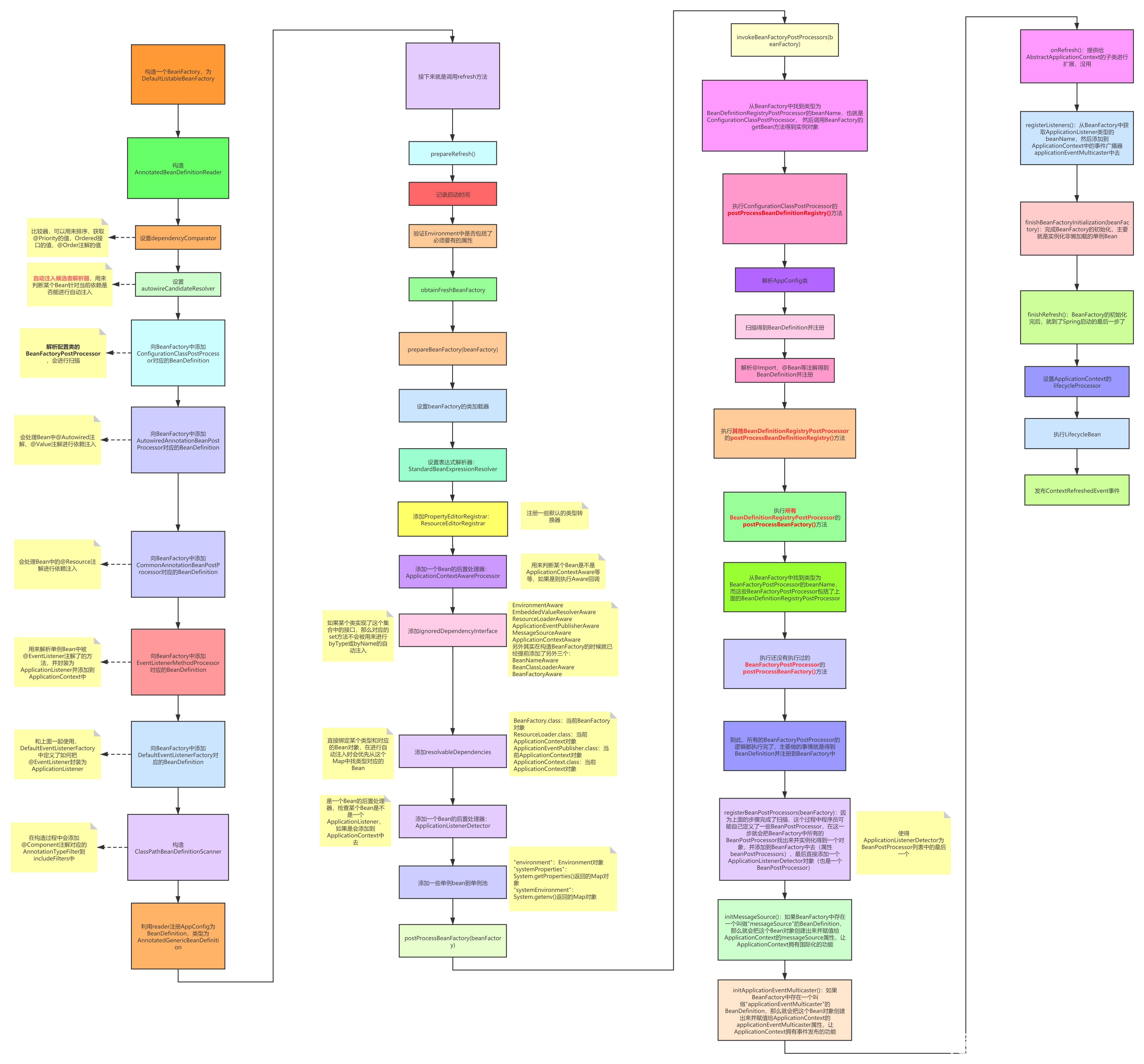 4. 在源码中会更复杂,⽐如源码中会提供⼀些模板⽅法,让子类来实现,比如源码中还涉及到⼀些 BeanFactoryPostProcessor和BeanPostProcessor的注册,Spring的扫描就是通过BenaFactoryPostProcessor来实现的,依赖注⼊就是通过BeanPostProcessor来实现的