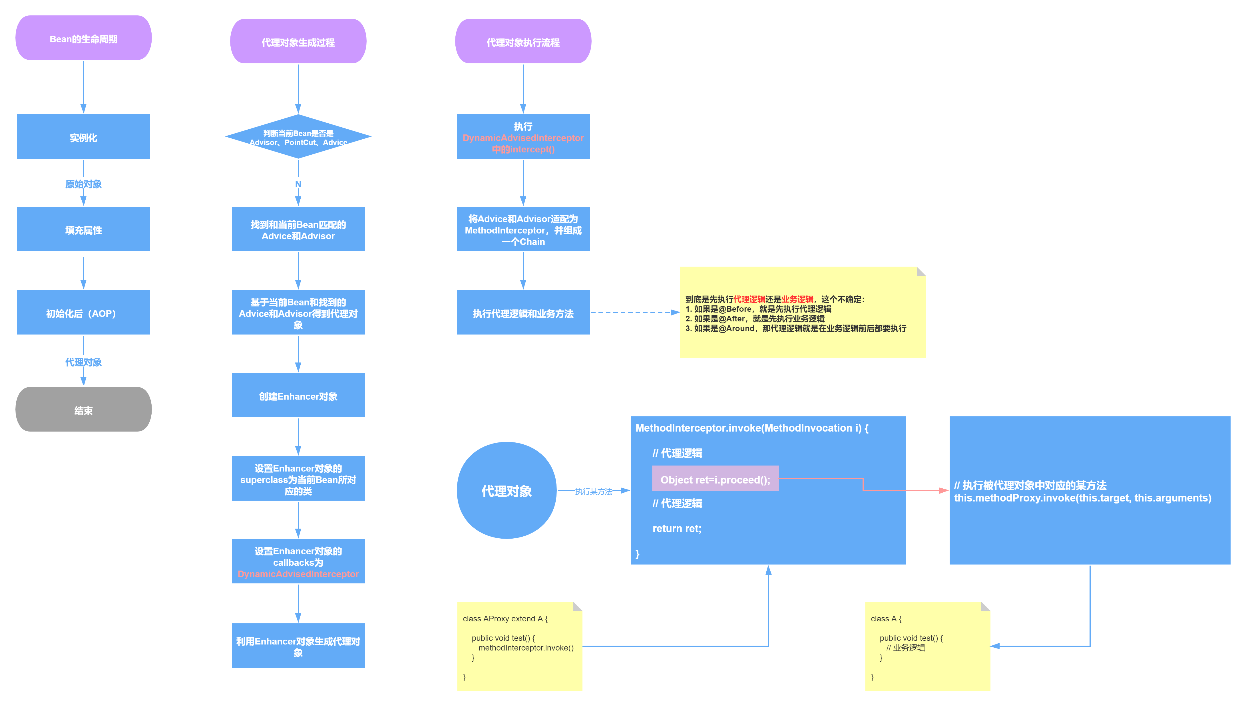 - 利⽤BeanDefinition创建Bean就是Bean的创建⽣命周期,这期间包括了合并BeanDefinition、推断构造⽅法、实例化、属性填充、初始化前、初始化、初始化后等步骤,其中AOP就是发⽣在初始化后这⼀步骤中