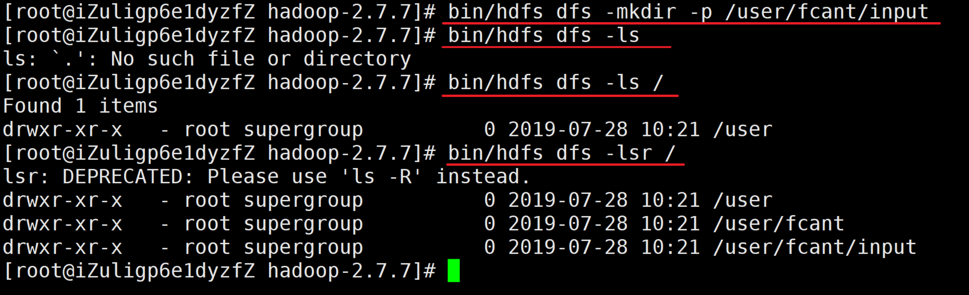[root@iZuligp6e1dyzfZ hadoop-2.7.7]# bin/hdfs dfs -lsr /