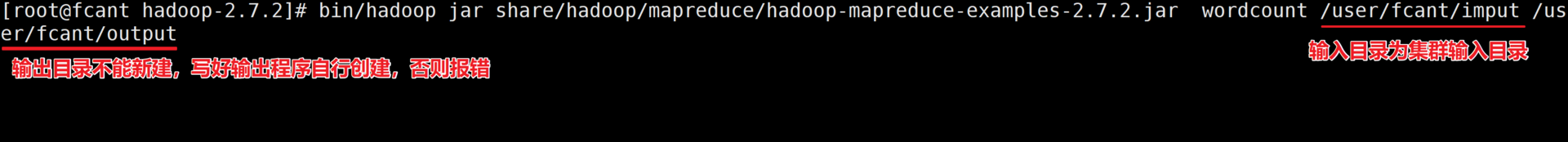 [root@fcant hadoop-2.7.2]# bin/hadoop jar share/hadoop/mapreduce/hadoop-mapreduce-examples-2.7.7.jar wordcount /user/fcant/imput /user/fcant/output