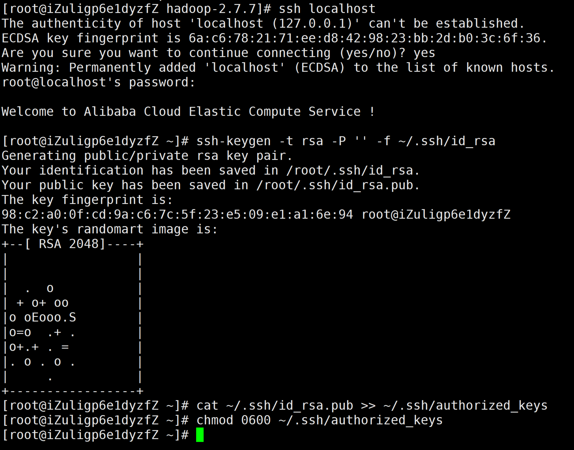 [root@iZuligp6e1dyzfZ ~]# ssh-keygen -t rsa -P '' -f ~/.ssh/id_rsa