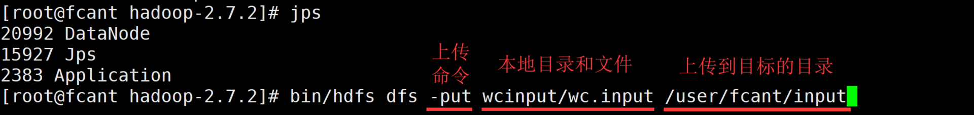 [root@fcant hadoop-2.7.2]# bin/hdfs dfs -put wcinput/wc.input /user/fcant/input