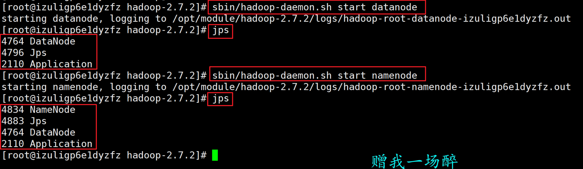 starting datanode, logging to /opt/module/hadoop-2.7.2/logs/hadoop-root-datanode-izuligp6e1dyzfz.out