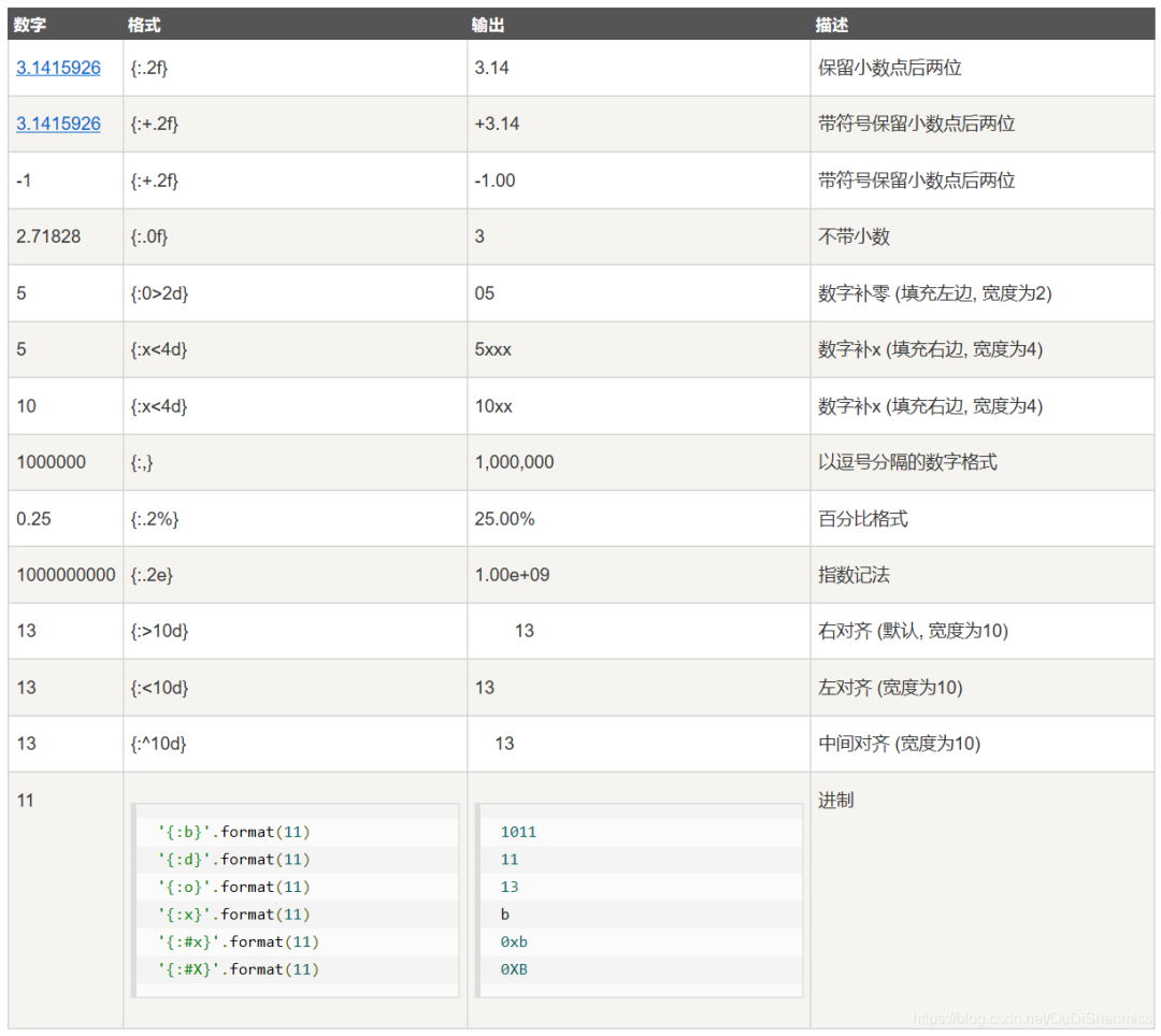 **数字格式化**<br />> ^, <, > 分别是居中、左对齐、右对齐,后面带宽度, : 号后面带填充的字符,只能是一个字符,不指定则默认是用空格填充。> + 表示在正数前显示 +,负数前显示 -;(空格)表示在正数前加空格> b、d、o、x 分别是二进制、十进制、八进制、十六进制。【例子】