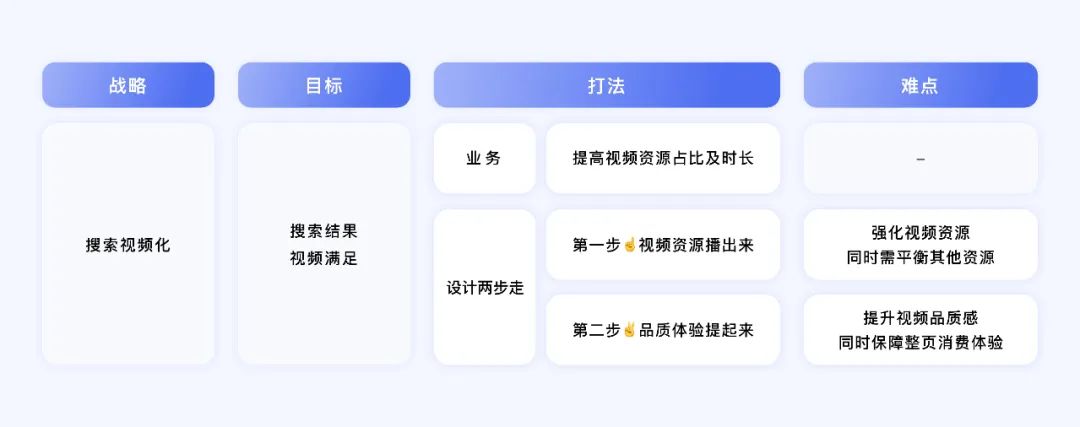 百度搜索结果为多类型资源混排构成,随搜索视频化战略转型,视频资源在结果页占比大幅提升,视频既需遵循整页基础设计规范,保障用户搜索体验一致性;同时又需持续打磨,提升视频资源独有的播放体验品质感。所以如何在保障整页消费体验基础上,最大限度的提升视频品质感是我们面对的一大难题。基于此我们采用两步走打法:第一步视频资源播出来、第二步品质体验提起来。