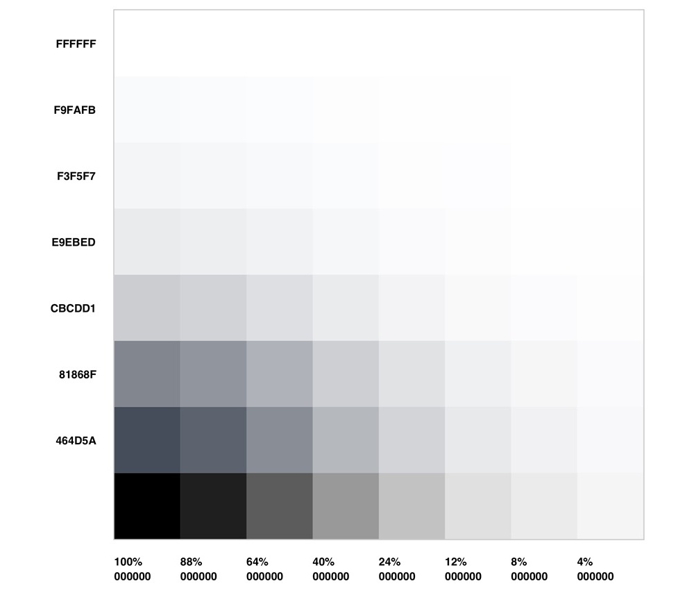 为构建一个高效易用的灰色调色板,我们将蓝灰色彩作为 Y 轴,有透明度的中性灰色作为 X 轴,两者透明度保持一致,建立起腾讯文档有梯度的、丰富的灰色调色板。