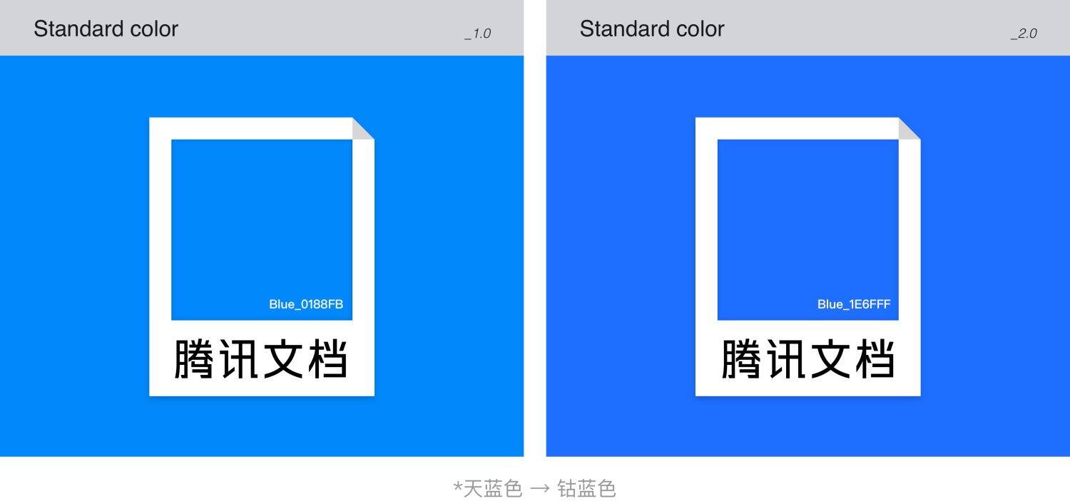我们将标准色由平静的天蓝色,升级为更加生动、进取、科技、可靠的明亮清澈的钴蓝色。这种蓝色具有更多的电子意味,蕴含了更多的活力和想象力,承载了腾讯文档对未来数字世界新挑战的态度和形象的进化。