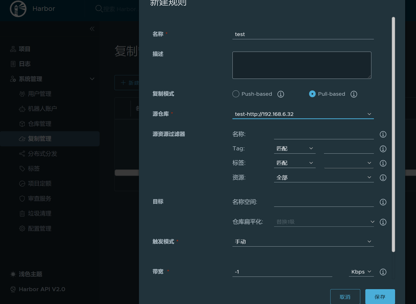 4、第二台harbor上新建复制规则实现到第一台harbor的单向复制