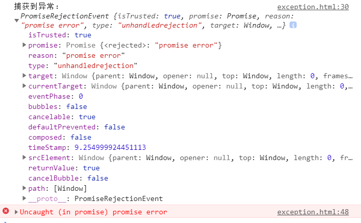 window.addEventListener("unhandledrejection", function(e){ // e.preventDefault(); // 阻止异常向上抛出 console.log('捕获到异常:', e); }); Promise.reject('promise error');