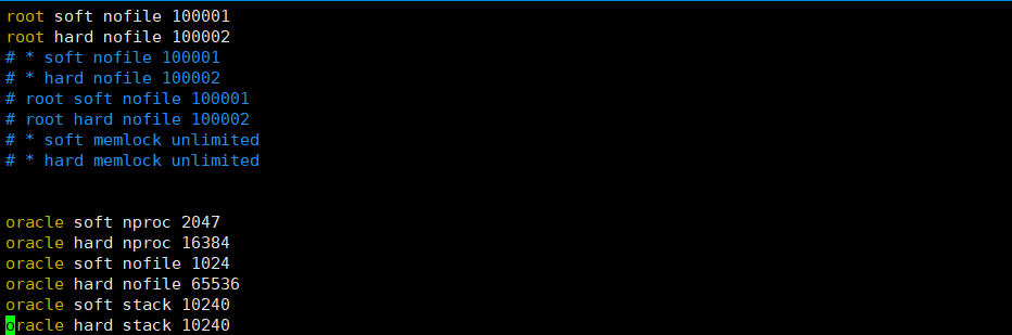 vim /etc/security/limits.conforacle soft nproc 2047oracle hard nproc 16384oracle soft nofile 1024oracle hard nofile 65536oracle soft stack 10240oracle hard stack 10240