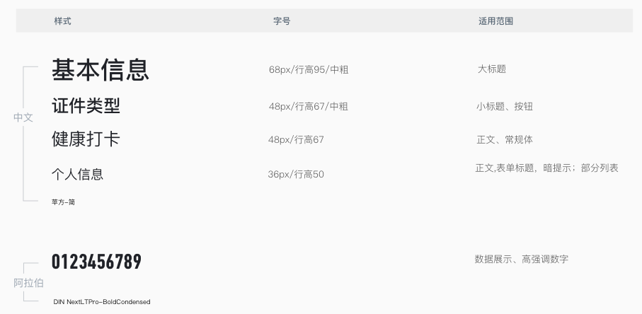 - 字体类型的使用。使用带有数字屏幕的设备阅读时,无衬线字体 (例如黑体等) 看起来会比有衬线 (例如宋体等) 字体更醒目而且轮廓清晰。所以在字体上我们沿用了政务业务中制定的字体规范中的苹方字体。如果有需要进行数据展示或者高强调的数字时同样选择了无衬线的 DIN NextLTPro-BoldCondensed 字体。