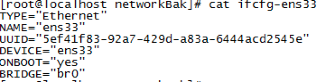 [root@localhost docker]# cd /opt/[root@localhost docker]# mkdir docker[root@localhost opt]# cd docker/[root@localhost docker]# mkdir networkBak[root@localhost docker]# cd networkBak/[root@localhost networkBak]# mkdir bak[root@localhost networkBak]# cp /etc/sysconfig/network-scripts/ifcfg-ens33 ./[root@localhost networkBak]# ls bak ifcfg-ens33[root@localhost networkBak]# cp ifcfg-ens33 ./bak/[root@localhost networkBak]# cp ifcfg-ens33 ifcfg-br0