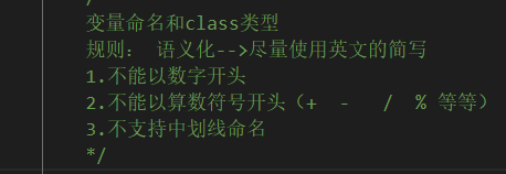 变量命名和class类型<br /> 规则: 语义化-->尽量使用英文的简写<br /> 1.不能以数字开头<br /> 2.不能以算数符号开头(+ - / % 等等)<br /> 3.不支持中划线命名<br />