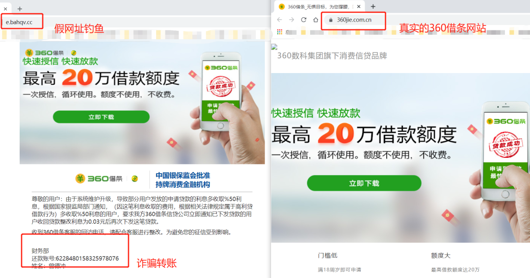 扫描二维码链接跳转到网址http://e.ba***hqv[.]cc,该网址为钓鱼网站,模仿360借条官方网站。主要目的诈骗消费者进行转账。