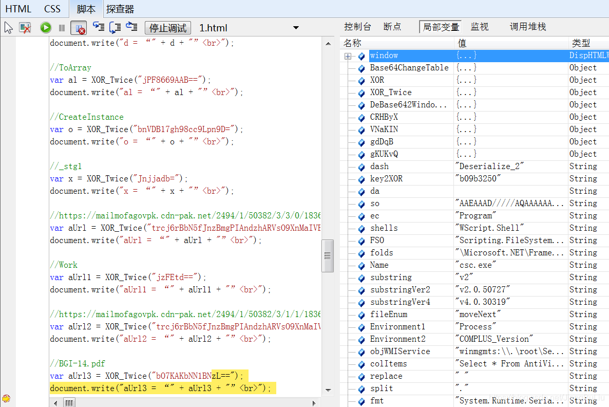 //Base64换表解码 function Base64ChangeTable(str) { var b64 = "BatM69NObVHEpjmJdciAnzTgsXwxD7ChL5o3rPlQGqW4ekZSKRU01Iy28uvYfF+/="; var b, result = "", r1, r2, i = 0; for (; i < str.length;) { b = b64.indexOf(str.charAt(i++)) << 18 | b64.indexOf(str.charAt(i++)) << 12 | (r1 = b64.indexOf(str.charAt(i++))) << 6 | (r2 = b64.indexOf(str.charAt(i++))); result += r1 === 64 ? gKUKvQ(b >> 16 & 255) : r2 === 64 ? gKUKvQ(b >> 16 & 255, b >> 8 & 255) : gKUKvQ(b >> 16 & 255, b >> 8 & 255, b & 255); } return result; }; //异或 function XOR (key, bytes) { var res = []; for (var i = 0; i < bytes.length; ) { for (var j = 0; j < key.length; j++) { res.push(gKUKvQ((bytes.charCodeAt(i)) ^ key.charCodeAt(j))); i++; if (i >= bytes.length) { j = key.length; } } } return res.join("") } //两次异或,把前一次异或的结果作为Key function XOR_Twice(strXOR2) { return XOR(key2XOR,Base64ChangeTable(strXOR2)) }JavaScript调试方式