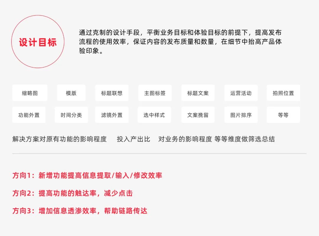 通过克制的设计手段,平衡业务目标和体验目标的前提下,提高发布流程的使用效率,保证内容的发布质量和数量,在细节中抬高产品体验印象。