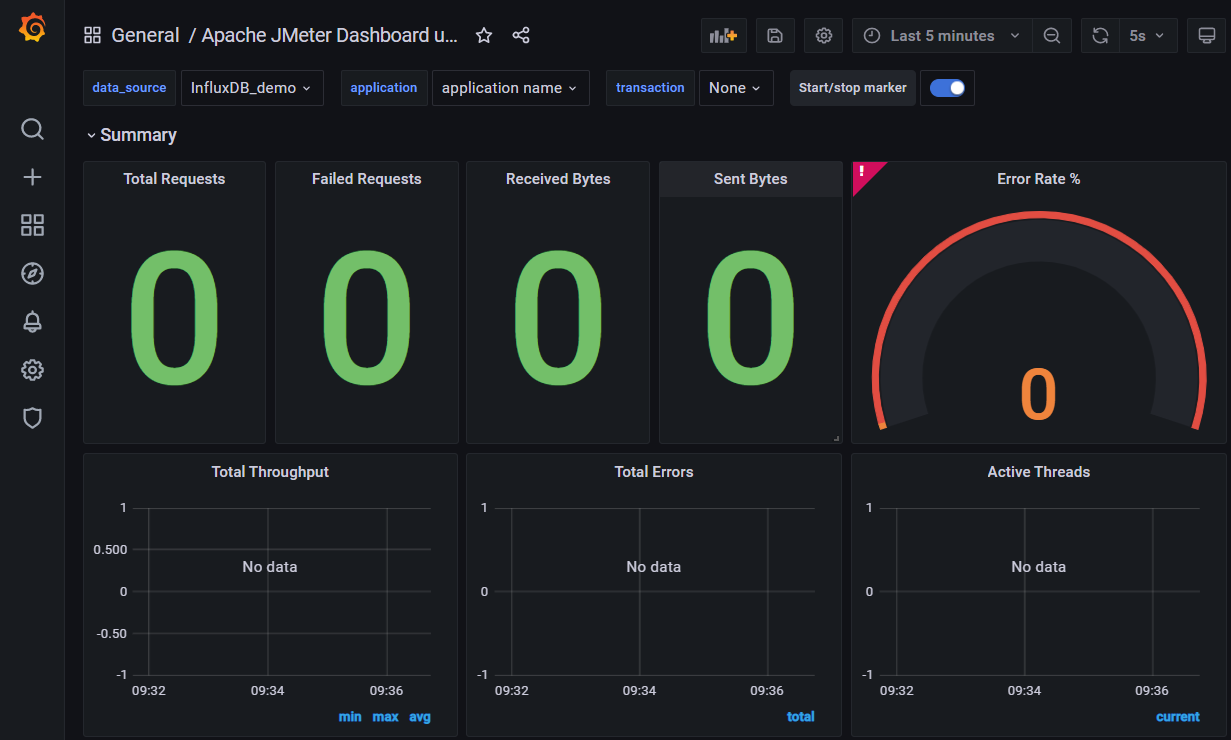 Grafana一种可视化监控工具,社区非常强大。拥有大量的仪表盘和解决方案。可以获取来自各类数据库中的数据。这里使用的使Influxdb数据库信息。这里用作性能测试结果的展示安装步骤如下:<br />①查看并拉取镜像<br />##查看镜像<br />docker search grafana<br />## 根据镜像名称拉取镜像<br />docker pull grafana/grafana②运行镜像并生成容器<br />③运行镜像并生成容器<br />docker run --name my_grafana -p 3000:3000 grafana/Grafana<br />④Grana配置influx<br />访问Grafana:访问网址为[http://localhost:port](http://localhost:port),用户名和密码都为admin<br />⑤添加数据源,并选择Influxdb,并配置相关数据如图导入influxDB所示:<br /><br />图7导入influxDB<br />⑥进入Grafana模板官网下载Jmeter仪表盘模板,并导入<br />进入官网[https://grafana.com/grafana/dashboards](https://grafana.com/grafana/dashboards),下载Jmeter压测仪表盘,导入并配置成功以后如图仪表盘所示。<br /><br />图8 仪表盘
